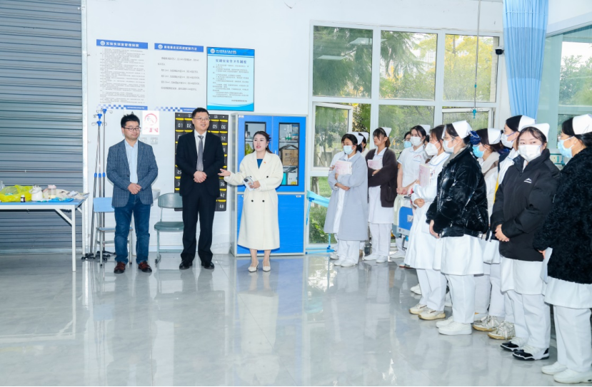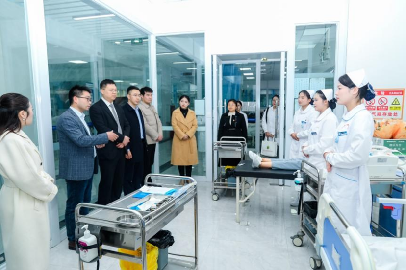 专家团队参观了学院医护康养学院实训中心,观摩了正在进行备战技能比赛的同学的操作过程,并亲自上阵从操作手法到流程安排,对同学们的技能进行了细致入微的指导。专家们还深入学生课堂,为在实训室上基护课的同学进行了亲切寄语,鼓励他们要扎实学好专业知识,为未来的护理工作打下坚实的基础。