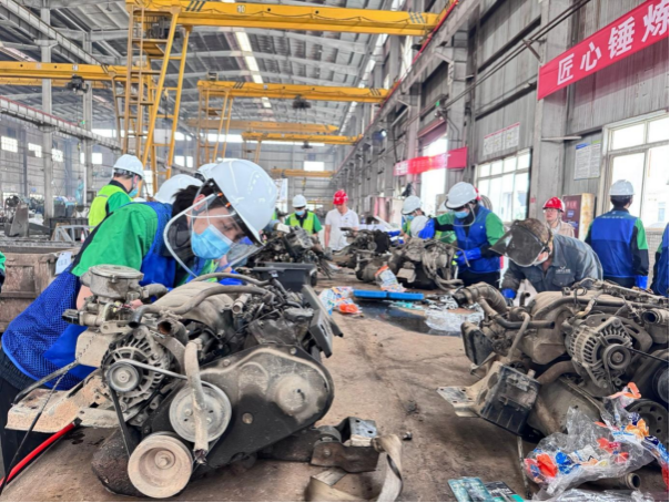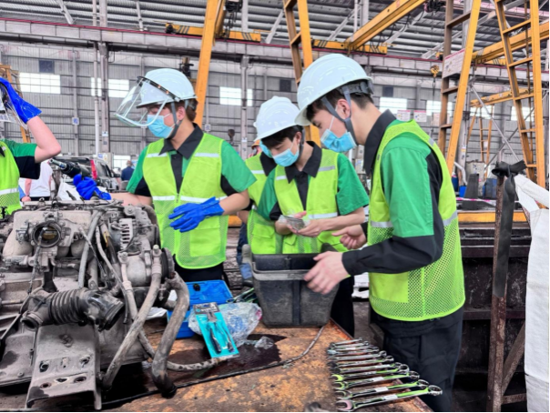 随后,企业负责人为同学进行了进入车间的注意事项、防护装备穿戴、操作合规性等安全培训。进入车间后,企业指导教师为学生讲解了本次实训所要遵循的拆解流程及其规范性和拆解效率。一切准备工作就绪后,正式进入实训环节。学生们按分组进行实训,每组按照分工进行工具分配、发动机拆解、分类放置等工序有序开展。