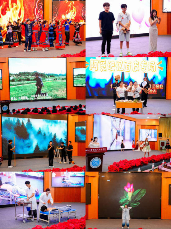 典礼穿插安排了多个赛项的汇报展演,彰显了职业教育实践育人的丰硕成果。教育学院带来自编儿童剧《阿依蒙格》;主持人大赛优秀选手呈现《心动零距离》;计算机与大数据学院展示短视频作品;数字经济学院带来《趣味直播》;智能建造与制造学院进行《工程测量》技能展示;艺术学院展示视觉艺术设计作品;医护康养学院带来拔罐和古法健身操表演;文创旅游学院带来《技能为笔时装作章》时装秀。精彩纷呈的节目内容,充分体现了各赛项的训练成果,赢得在场师生的阵阵掌声。