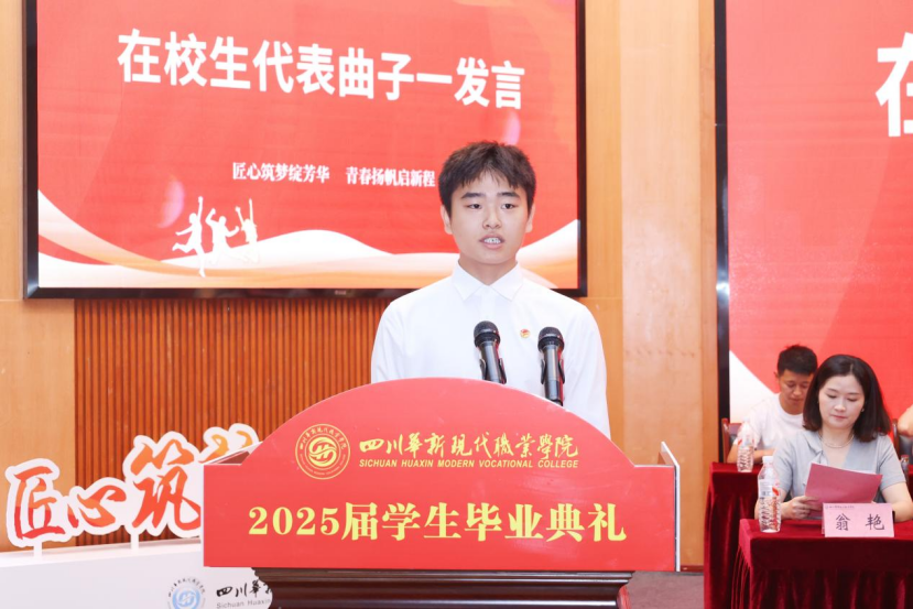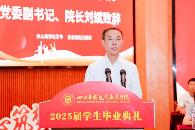 刘斌作题为《匠心筑梦绽芳华,青春扬帆启新程》的讲话,向全体毕业生送上美好祝福,向辛勤付出的教职工和关心支持学院发展的家长、校友以及社会各界人士致以感谢。他勉励同学们胸怀家国、勇立潮头,传承“艰苦创业、谦虚好学、团结和谐、追求卓越”的华新精神,在科技革命与时代变革中书写青春华章。