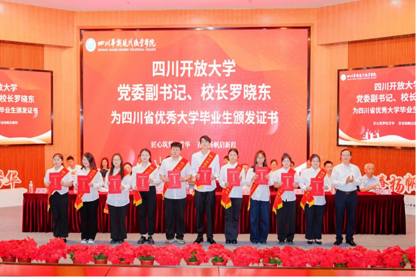 党委副书记李瑜宣读四川省优秀毕业生表彰文件,罗晓东为四川省优秀大学毕业生代表颁发证书。