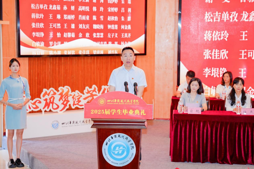 骊歌奏响,青春启航。6月21日上午,四川华新现代职业学院2025届学生毕业典礼在学术报告厅隆重举行。四川开放大学党委副书记、校长罗晓东,四川华新现代职业学院党委副书记、院长刘斌等全体院领导出席。师生代表、校友代表齐聚一堂,共同见证这一庄严而温情的时刻。典礼由副院长翁艳主持。