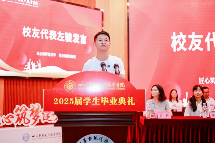 2015届电商专业毕业生左骏作为优秀校友代表发言。他分享了从“打底裤王子”到助农电商领军者的创业历程:“母校实训室的‘实战课’教会我‘拳拳到肉的商战真经’,如今2000亩豌豆尖基地带动500户农户增收,正是‘厚德精技’校训的生根发芽。”他寄语学弟学妹“榨干每一寸实训土壤,让技能反哺乡土”。