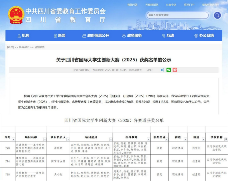 近日,“建行杯”四川省国际大学生创新大赛(2025)比赛结果正式公示,华新职院报送的《未语绸默——基于脑电信号的早期阿尔茨海默症筛查系统》《彝脉相承——用现代设计语言重塑彝族传统服饰之美》《孕美如初——一款智能产后康复收腹带》三个项目在激烈角逐中脱颖而出,斩获职教赛道创意组银奖,为学院创新创业教育工作写下浓墨重彩的一笔。