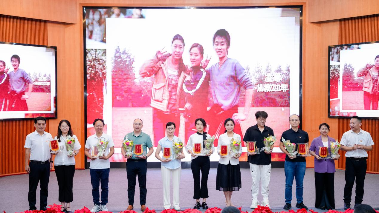 大会隆重举行了“荣光礼赞——向从教二十载以上教师致敬”仪式。黄健全、伍小飞、岳训涛等54位从教20年及以上的教师依次上台,接受学院赠送的纪念品和鲜花。他们数十年如一日坚守讲台,用青春与智慧诠释了教育的真谛。