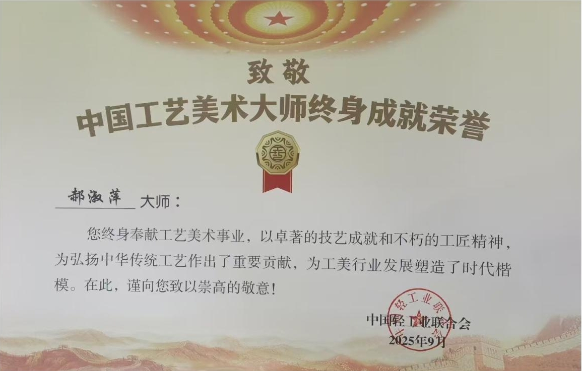 在此次盛会中,四川华新现代职业学院中国工艺美术大师传承创新基地核心成员、亚太手工艺大师、蜀绣国家级代表性传承人郝淑萍大师,荣获中国轻工业联合会授予的“中国工艺美术大师终身成就荣誉”。这一荣誉的获得,既是对郝淑萍大师数十年如一日深耕蜀绣领域、以匠心传承技艺的最高肯定,更是对华新职院在工艺美术人才培养、非遗文化传承创新工作中不懈努力的充分认可,彰显了学院在非遗文化传承与工艺美术教育领域的突出实力。