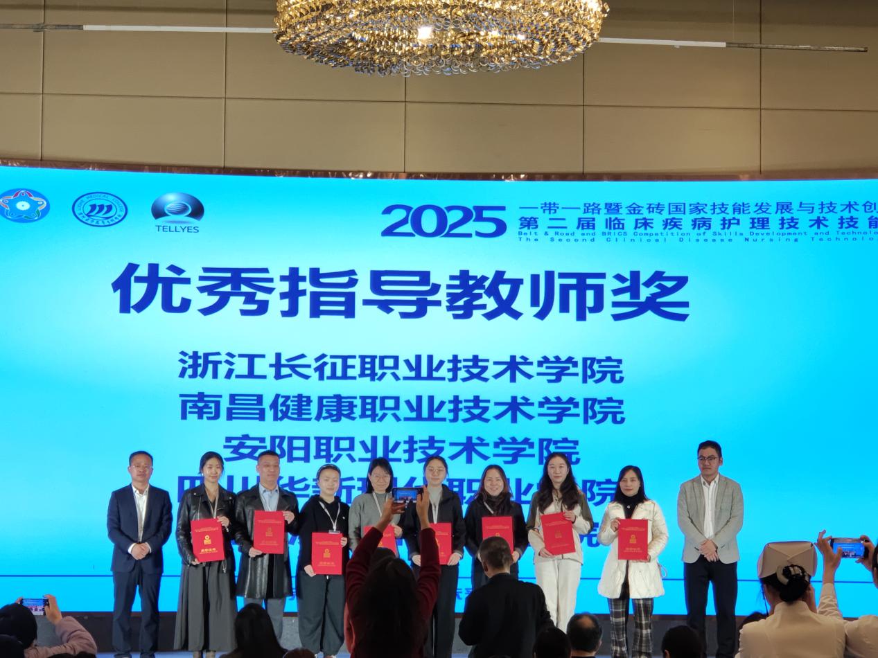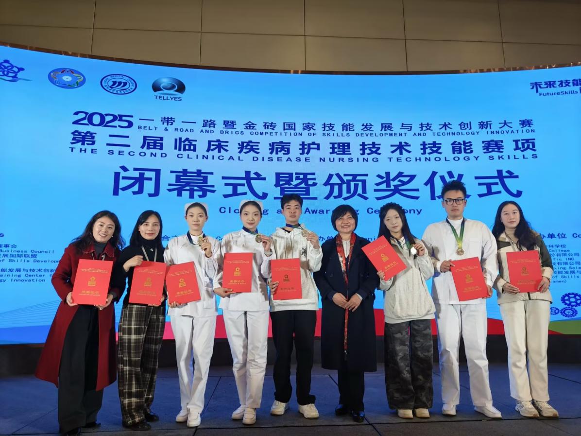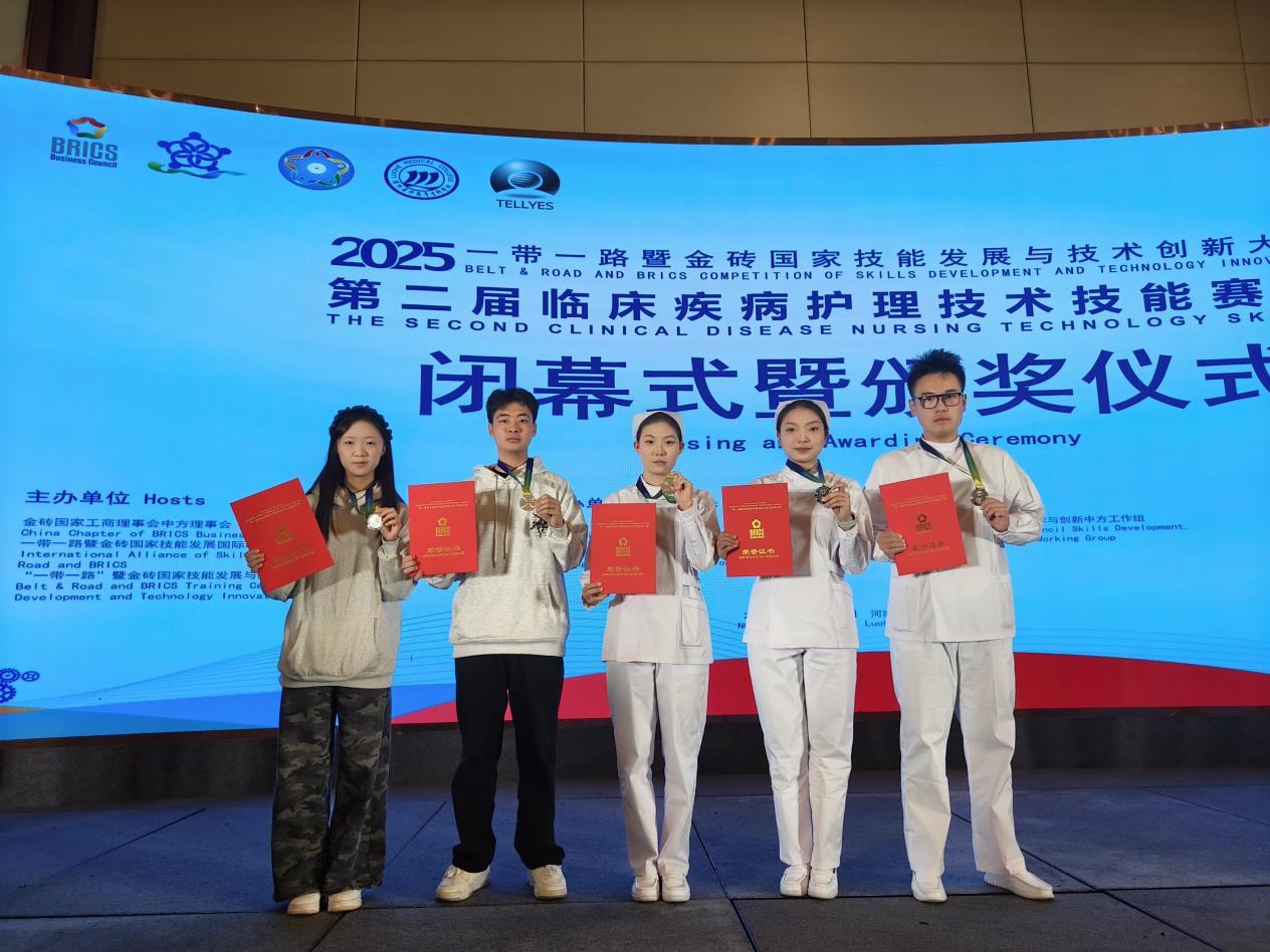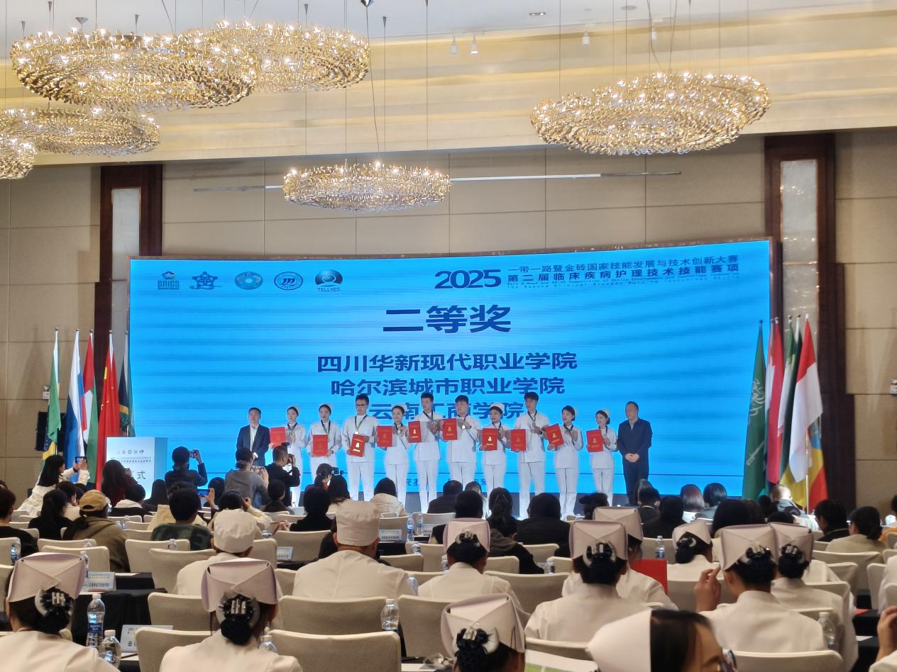 11月23日,2025“一带一路”暨金砖国家技能发展与技术创新大赛第二届临床疾病护理技术技能赛项在河南漯河医学高等专科学校落幕,四川华新现代职业学院医护康养学院代表队从全国众多参赛队伍中突围,最终捧回“二等奖”,并获得优秀指导教师奖项两个,学校获“优秀组织奖”。这份荣誉的背后,是学院以立德树人为根本、深耕护理人才培养的生动缩影。