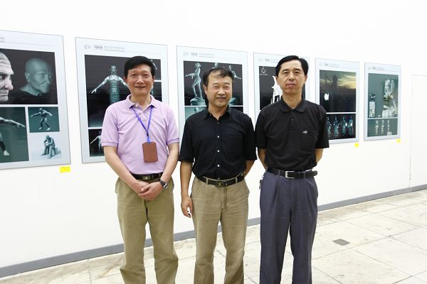 图片三:学院党委书记赵邦友、学院院长李建川和艺术系主任黄明元在参展作品前合影