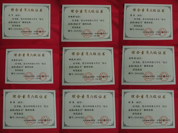 2010年四川省大学生“综合素质A级证书”评选结果已经揭晓,我院学子喜获证书。早在今年3月,院团委对我省大学生“综合素质A级证书”评选工作进行前期宣传,并组织各系团总支对符合条件的学生做好动员及申报准备工作。五月初接到团省委通知后,材料申报及审核工作在一周内顺利完成,最后共有13名学生通过院团委审核后进行上报认证。经共青团四川省委、四川省学生联合会考核评定,我院7名同学通过认证,他们是:经济管理系王飞、倪槐梓,旅游服务系刘腾跃、瞿丹,应用技术系冉际逢、刘琴,艺术系施凯杰7名同学。据悉,我院的A级证书通过率位居全省高职院校前几名。