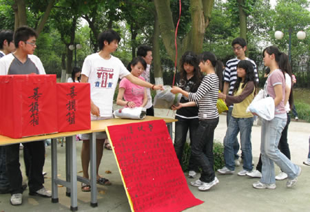 5月15日下午,我院在操场举行“众志成城,抗震救灾”爱心捐赠活动。在学院党委书记赵邦友的带领下,师生们踊跃捐资捐物,献上自己的一份爱心。此次活动充分体现了我院师生心系灾区、无私奉献的精神。