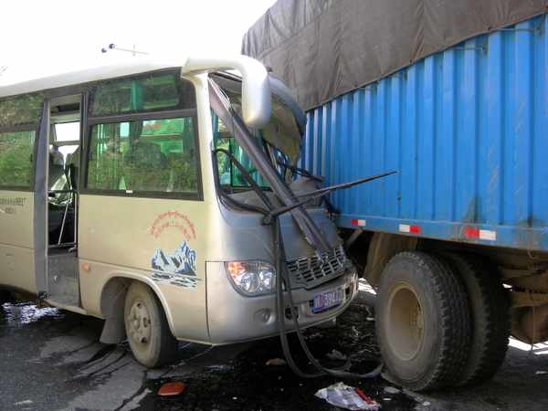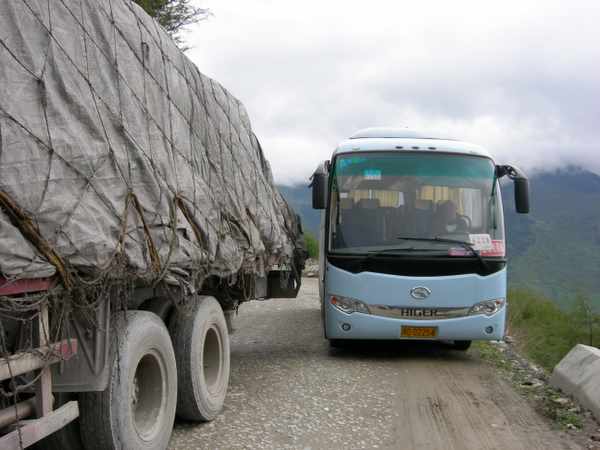 图四:一次惊险的错车,我们的客车险些被挤下悬崖