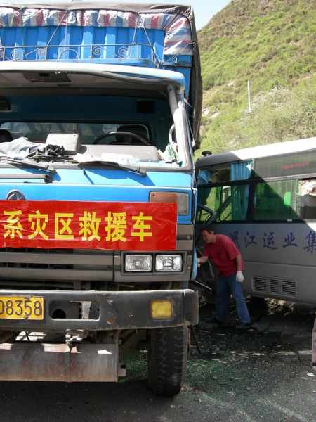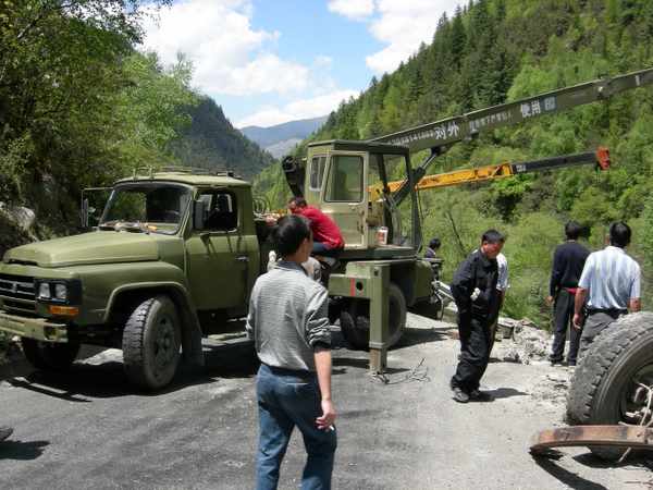 第二起车祸发生在梦笔山下山的路上,一辆满载救灾盐的卡车翻入溪沟,两辆起吊车正缓缓的吊起受灾车辆。好在这起车祸没有造成太大的人员伤亡,救灾司机的壮举让我们感动。两起车祸足足让我们堵了四个多小时,下午三点,我们的救援车终于到达了卓克基。