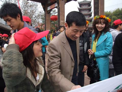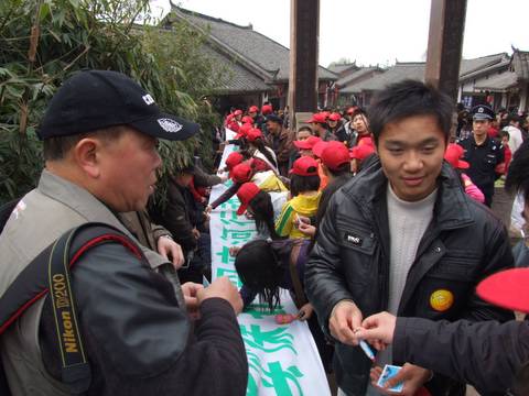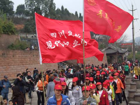 古镇上人山人海,志愿者们打着旗帜,有组织有纪律地穿梭在游人中间,身体力行地宣传环保,节能减排。同学们一边散发由团委、学生会统一印制的“节能环保纪念卡片”,一边劝阻那些正在乱扔垃圾的游客。红红的志愿者队伍成了洛带古镇上一道亮丽的风景线。