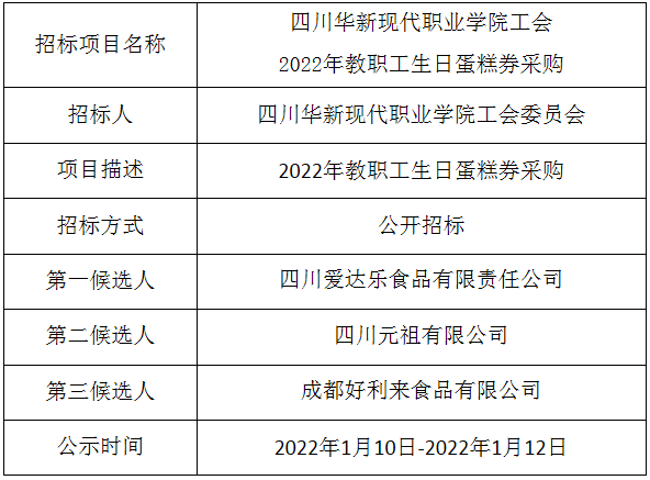 四川华新现代职业学院工会2022年教职工生日蛋糕券采购项目中标公示