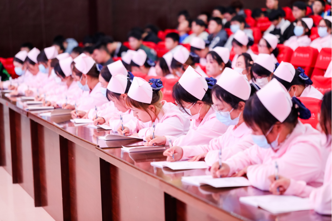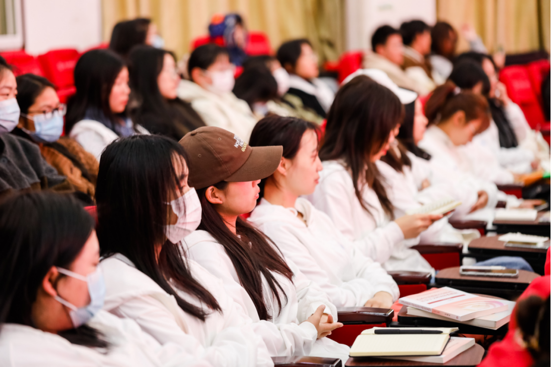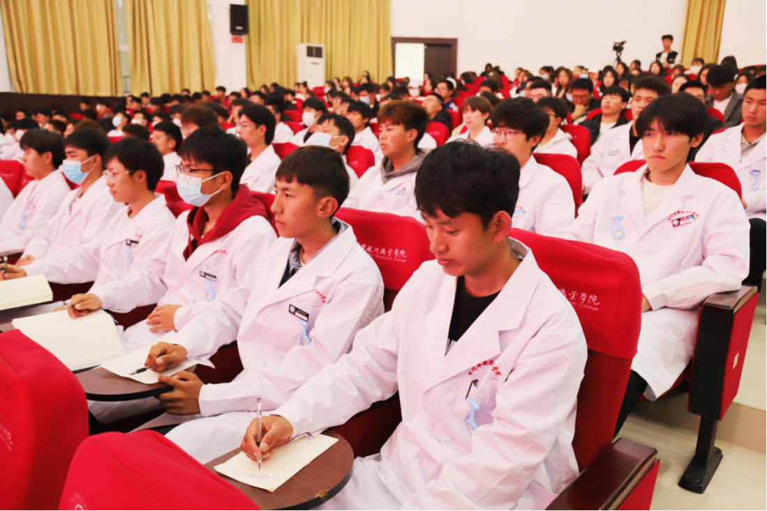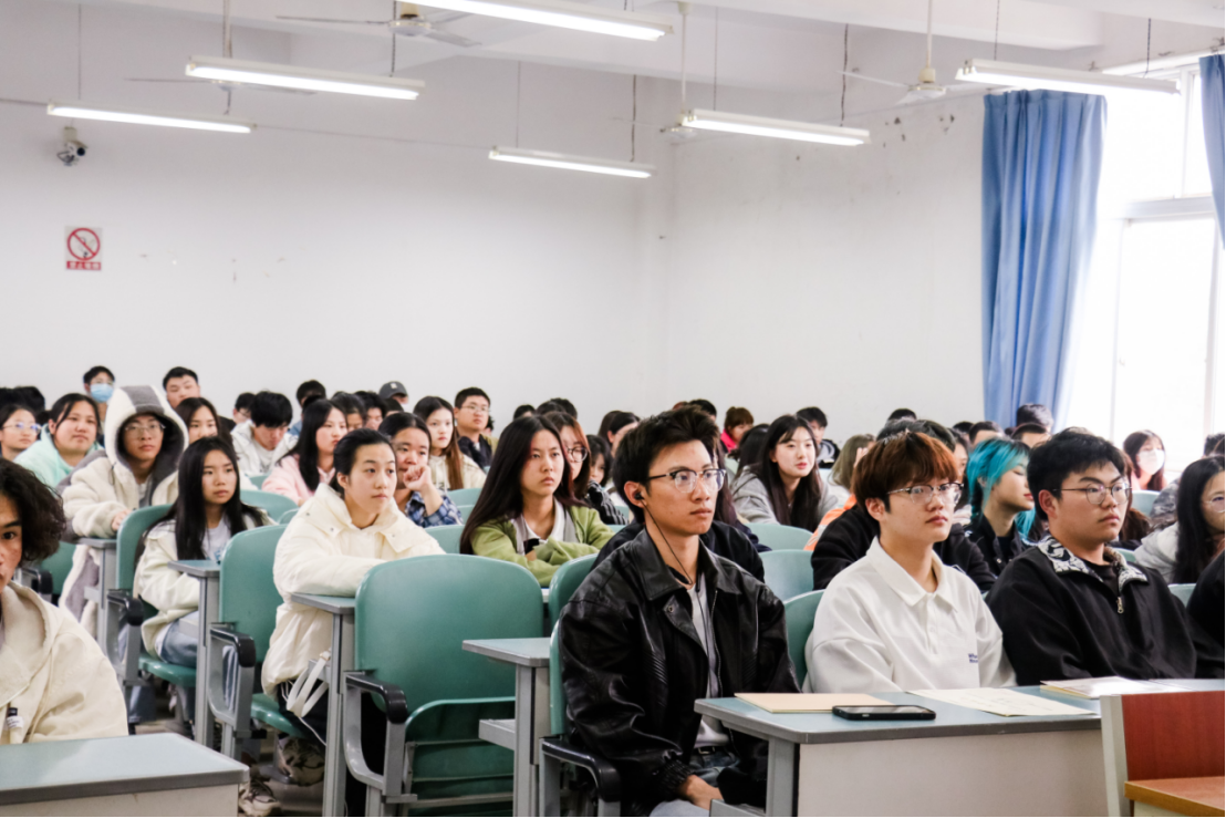 本次课程采取现场直播的形式进行,报告厅设置主会场,教学楼各教室设置分会场,全院2022级近5000名同学同步实时观看直播学习。