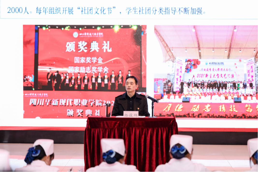 杨俊辉表示,四川开放大学全力支持办好华新学院,“十四五”规划明确提出了“三位一体”融合发展新格局,华新学院作为四川开放大学高等职业教育的主阵地,肩负着非常重大的职责和无比光荣的使命。华新学院坚持全面促进学生成才,服务学生发展。办学18年来,华新学院坚持以学生为中心,加快教育教学改革,创新人才培养模式;注重师资队伍培育,夯实学生成长基础;聚集综合素质培养,增强学生实践能力;推进校园文化营造,丰富学生学习生活;开展资助育人实践,解决学生实际困难;深化校企合作共建,增强学生职业技能;优化就业创业服务,提高学生就业质量。