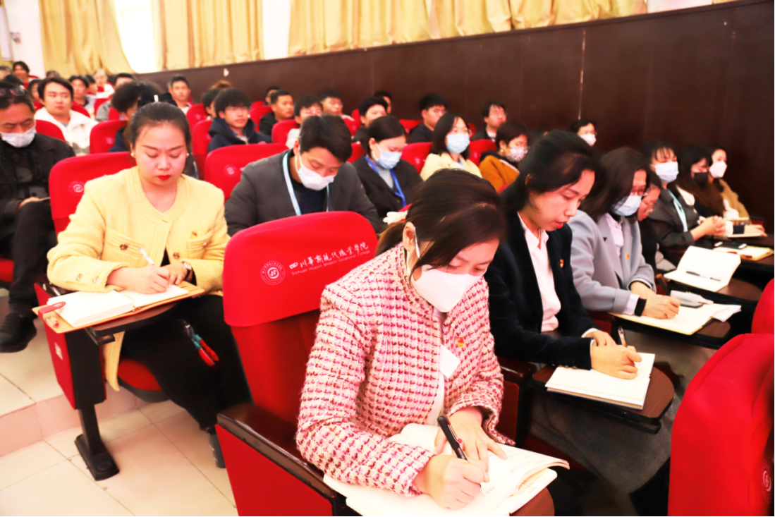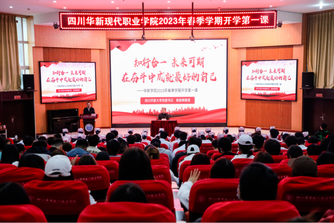 3月22日,华新学院隆重举行2023年春季学期开学第一课,深入贯彻落实习近平总书记关于职业教育的重要指示精神,在新的历史起点上全面认真学习好、宣传好、贯彻好党的二十大精神及省委十二届二次全会精神,全面贯彻落实教育部、省委教育工委、省教育厅关于“上好开学第一课”重要要求,充分发挥课堂育人主渠道作用,“思政课程”与“课程思政”协同发力,办好人民满意的职业教育,勉励广大同学坚定不移听党话、跟党走,立志做有理想、敢担当、能吃苦、肯奋斗的新时代好青年,为全面建成社会主义现代化强国,实现中华民族伟大复兴的中国梦贡献青春力量。四川开放大学党委书记杨俊辉授课,四川开放大学党委副书记、华新学院党委书记陈建生主持,华新学院党委副书记、院长刘斌等院领导聆听授课。