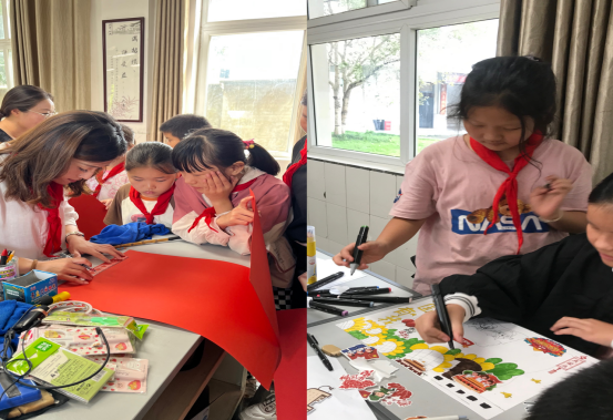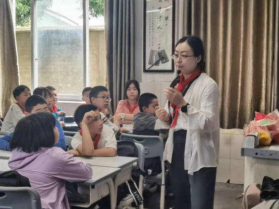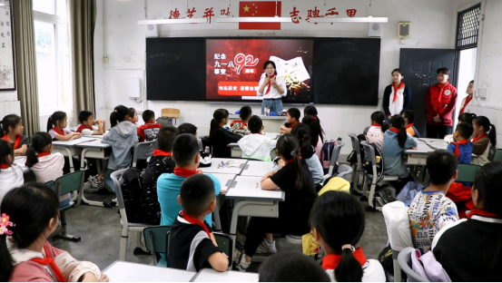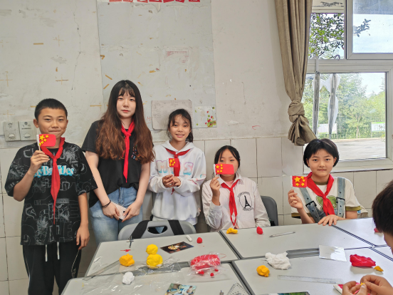 在五六年级的课堂上,马克思主义学院吕小凤、周可、曾理等老师为孩子们开展了听爱国故事、唱红色歌曲、做红色手工活动。吕小凤为孩子们讲述国庆相关的知识和故事。孩子们通过视频观看和吕老师的深情讲述了解历史背后的感人故事,故事激发了孩子们浓浓的爱国情。接着老师们带领孩子们一起唱红歌,李瑜、李凡也加入了课堂,与师生一起共唱红歌。