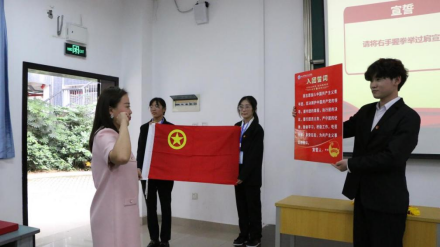 罗能铮带领新团员进行入团宣誓,新团员们面对团旗庄严宣誓,铮铮的誓词,代表着五四精神的传承与接力,更是青年们许下的责任和使命。
