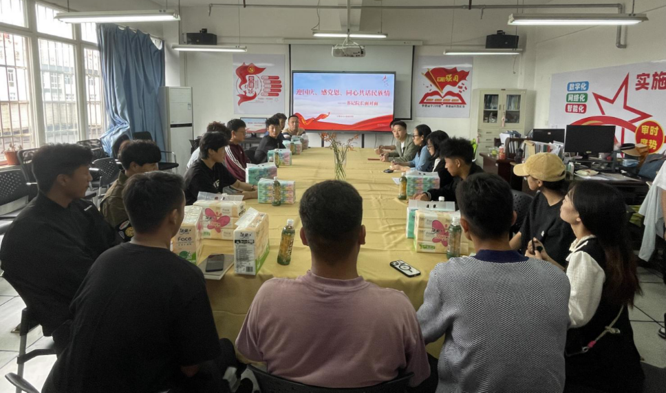 万绪林代表院领导提前送上国庆祝福,将卷纸、饮料、零食等送给每位学生,他关心询问大家在校期间学习和生活中面临的问题及在各民族交流等方面畅谈了自己的意见和建议。他强调,要坚定不移贯彻习近平总书记关于“铸牢中华民族共同体意识”的指示精神,各民族齐心协力,拧成一股绳,为建设社会主义现代化强国贡献自己的青春力量。