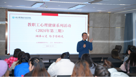 本次讲座特别邀请了国家二级心理咨询师、中级心理治疗师、九度精准马渝根心理健康服务团队成员、四川省心理卫生协会第一届心理治疗分会委员韩娣老师作为讲座专家。韩娣以其丰富的专业知识和实践经验,为教职工们带来了一场深入浅出的心理健康讲座。