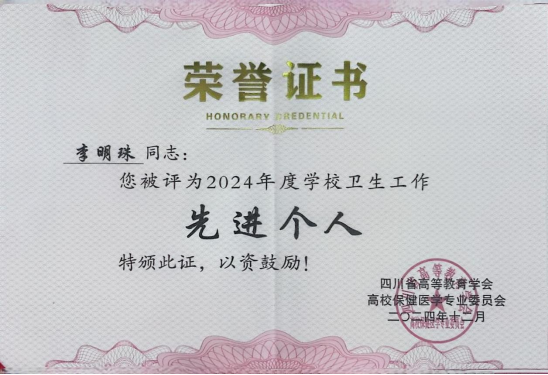 同时,李明珠凭借在高校卫生保健工作中的杰出表现,荣获“先进个人”荣誉称号。她长期以来致力于学生健康教育和疾病预防工作,以高度的责任心和敬业精神赢得了师生的广泛赞誉。此次获奖,既是对李老师个人努力的肯定,也是对学院卫生保健工作的鼓舞和激励。
