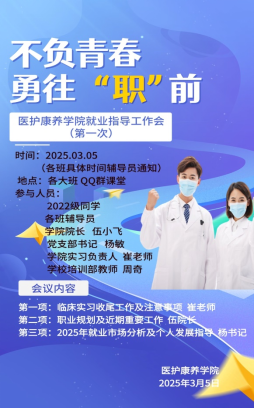 3月6日,医护康养学院2022级毕业生就业指导工作会(第一场)以线上形式成功举办,会议分为两场,2022级毕业生积极参与。此次会议旨在全面指导毕业生顺利完成学业,合理规划职业生涯,为即将踏入社会的他们提供有力支持。