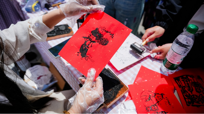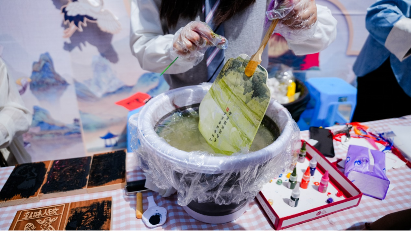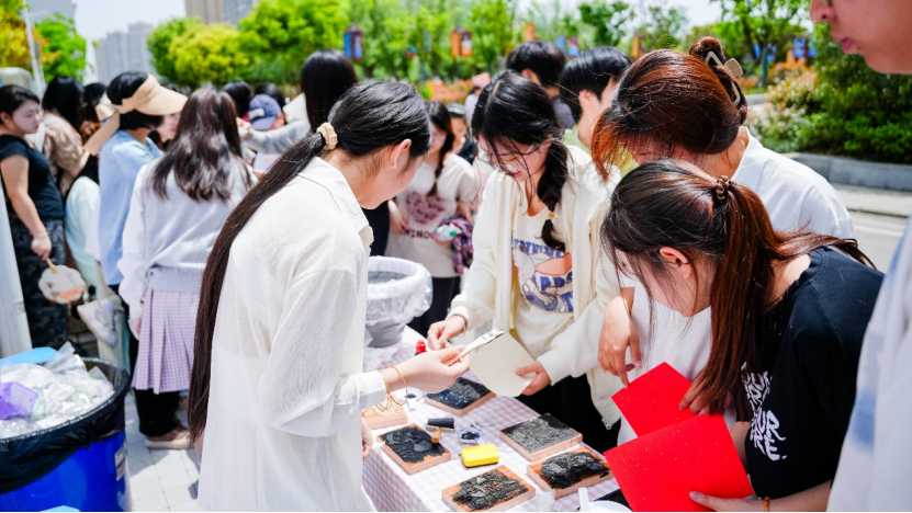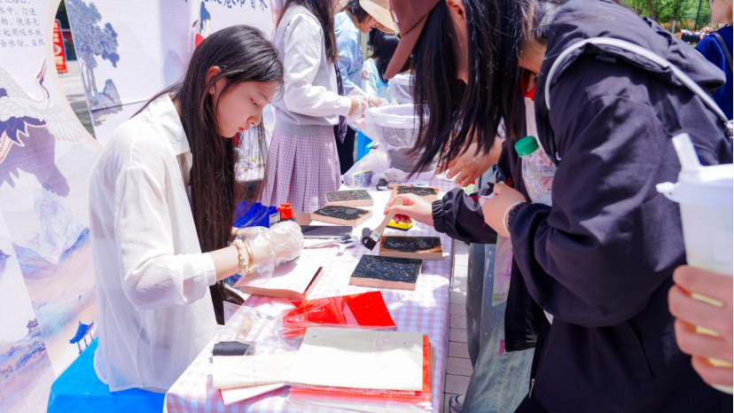一旁的雕版印刷体验区同样人头攒动。图书信息中心特别准备了哪吒等经典IP雕版,师生们手持棕刷,体验上墨、铺纸、拓印全过程,在墨香中感受古代印刷术的精妙。这些经典神话形象通过非遗技艺的呈现,既保留了传统韵味,又以年轻人喜闻乐见的形式拉近了与传统文化的距离。