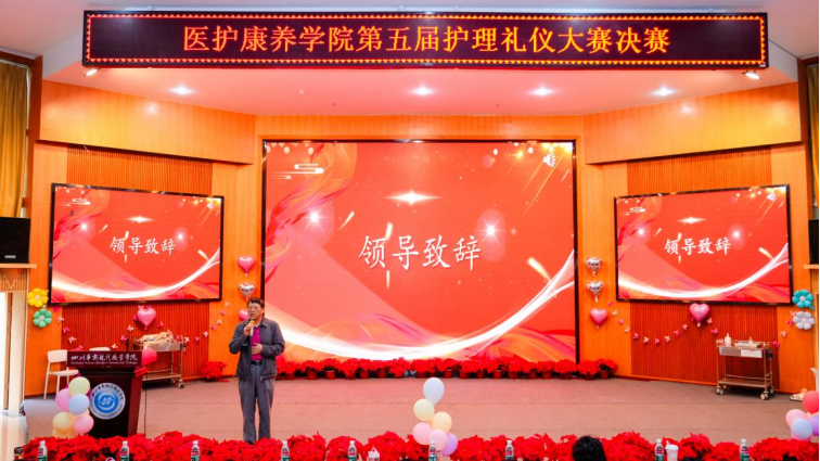 比赛开始前,医护康养学院院长伍小飞为决赛致辞。他强调了护理礼仪在医疗服务中的重要性,鼓励同学们在比赛中充分展现专业技能与优雅风采,以实际行动诠释医护人员的使命与担当,并对同学们未来的职业发展寄予了殷切期望。