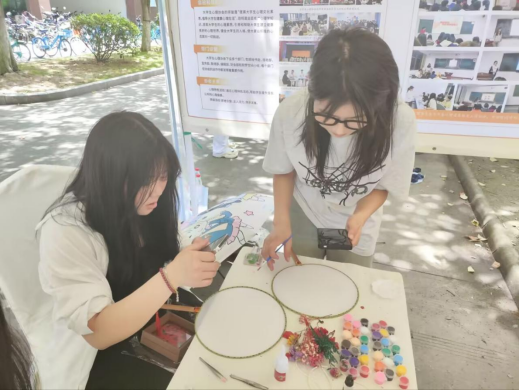 图五 心理健康中心老师与同学代表制作拓印帆布包