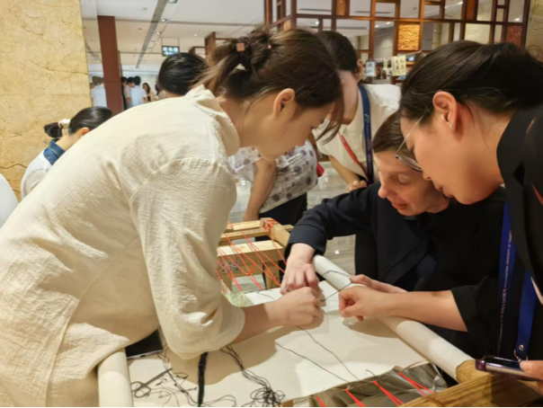 在活动现场,非遗工作坊的师生们向与会的校长们展示了蜀绣的精湛技艺,并指导他们亲手体验蜀绣的制作过程。校长们在老师的指导下,学习了如何穿针引线、如何在绸缎上刺绣,他们对这一古老艺术形式表现出了浓厚的兴趣和敬意。