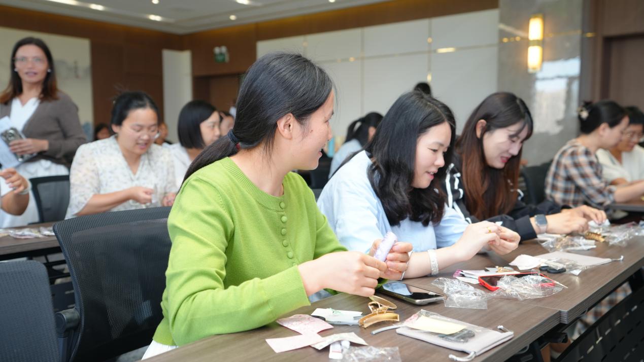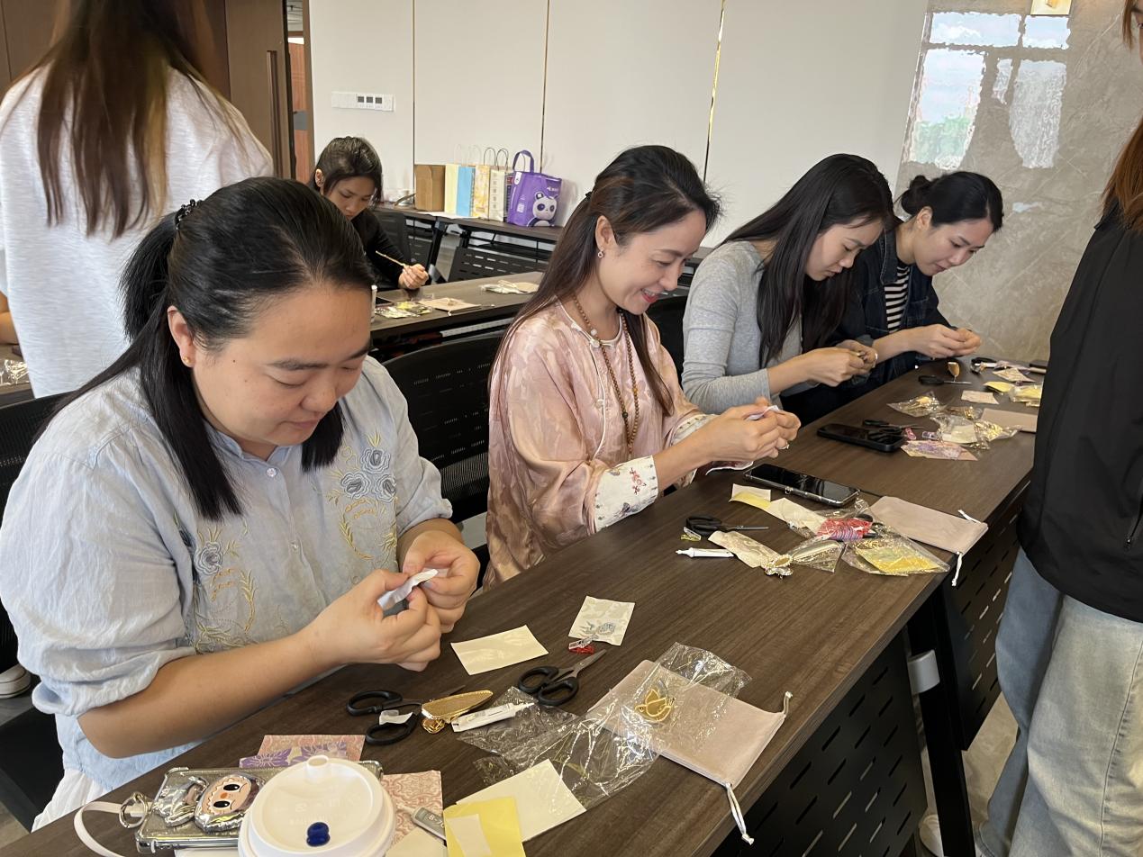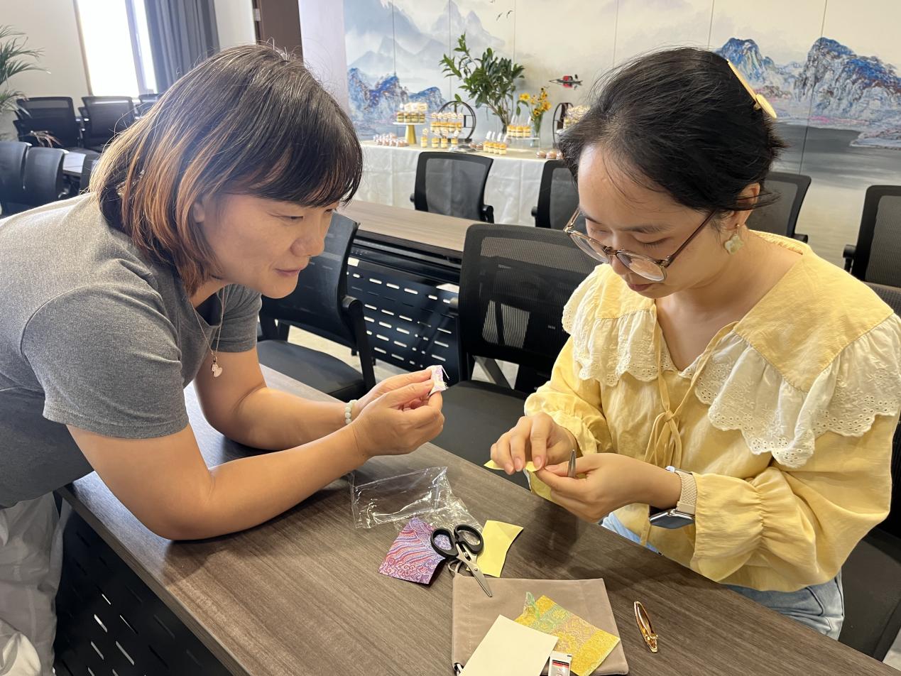 手工创作环节是本次活动的核心亮点。在指导老师的分步指导下,教职工们拿起提前准备好的织锦面料、配饰与工具,从裁剪、固定到搭配、组装,一步步将精美的锦缎转化为耳环、胸针、发夹等小巧精致的中秋饰品。过程中,大家相互交流技巧、分享创意,现场氛围温馨而热烈。指尖翻飞间,原本素雅的材料逐渐变成一件件兼具传统韵味与个性美感的手作,不仅承载着对中秋的美好期盼,更凝聚了对传统文化的热爱。