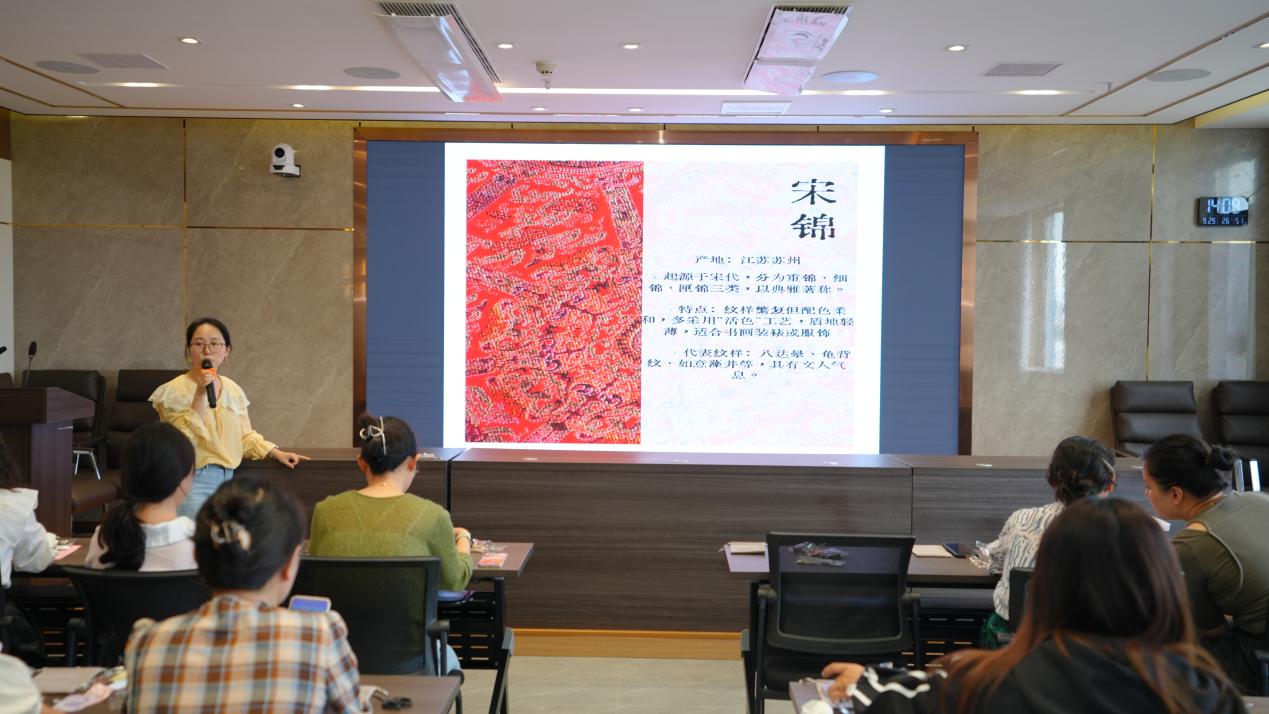 活动伊始,特邀的文创旅游学院蜀绣专业胥一兰老师以生动的讲解,揭开了蜀锦、宋锦的“非遗面纱”。从蜀锦“经起花”技艺的精巧绝伦,到宋锦“经纬交错”织造的细腻繁复,让在场教职工深刻领略到“东方瑰宝”背后千年的工艺沉淀与文化内涵。现场展示的蜀锦宋锦传世片段与现代创新作品,更让大家直观感受到非遗技艺在当代的生命力,不时发出阵阵赞叹。