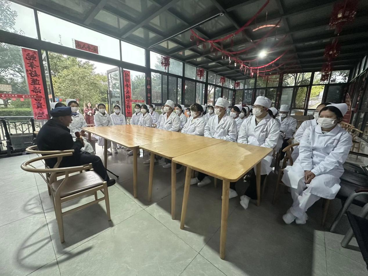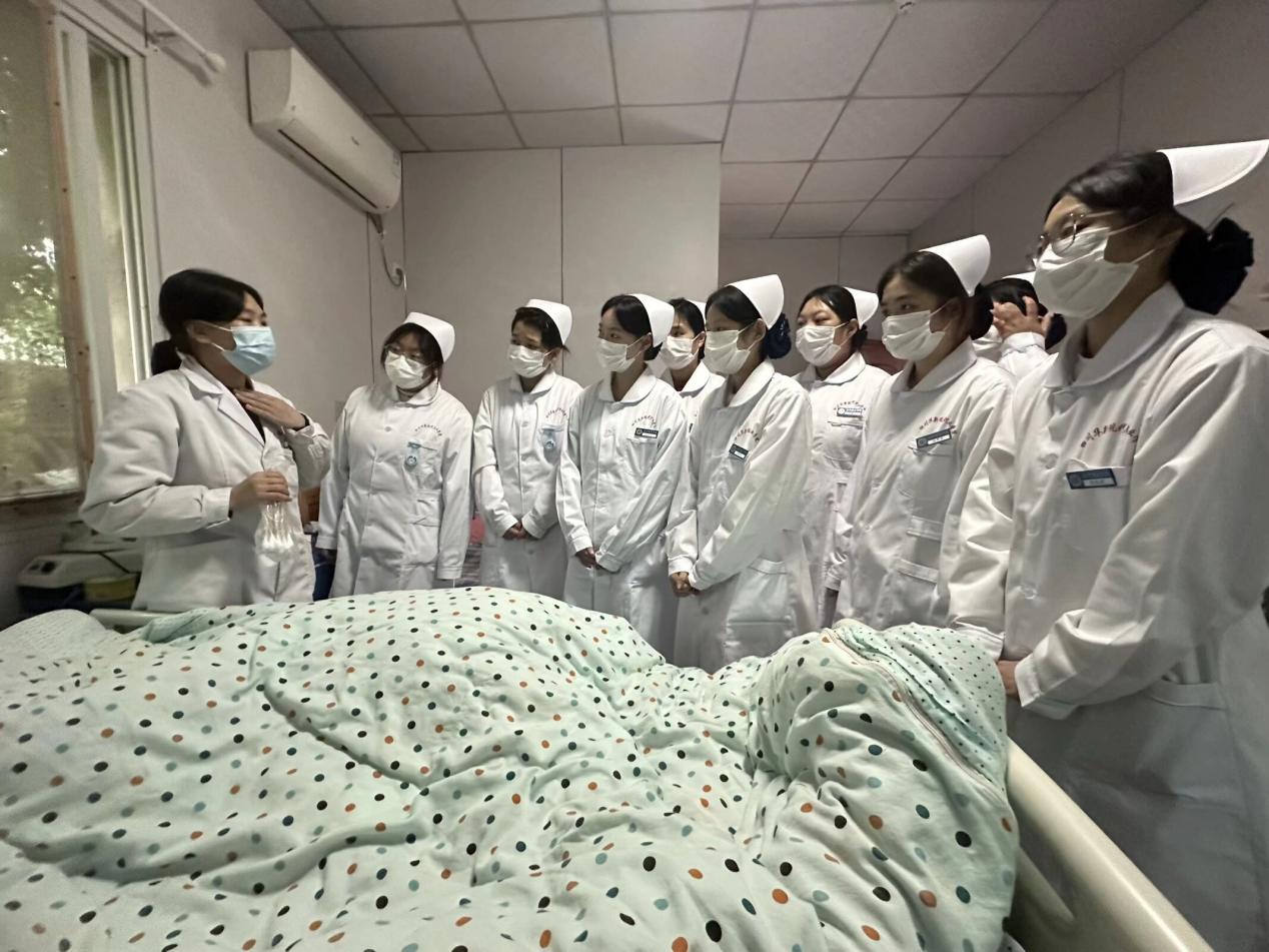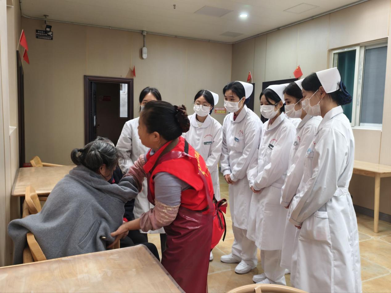 与此同时,支部书记杨敏、党员牟兰、钟琭葭、李明珠、李爽、蒲三霞、教师李婷婷带领的学生组的现场教学环节成为产教融合的核心亮点。学院分别在成都市第六人民医院、蓉东福寿养老院开展了现场教学活动。在专业教师与养老院护士组成的“双师” 团队带领下,学生们深入养老院每一间房间、每一个工作岗位,沉浸式学习老年护理实操技能。从日常起居照料、康复辅助训练到应急情况处理,“双师” 团队结合岗位实际需求手把手指导,将课堂理论与行业实践精准对接。李婷婷老师更是以真实病例为教材,开展现场教学讲授,让学生在服务老人的过程中深化专业认知,实现 “学中做、做中学” 的职业教育培养目标。