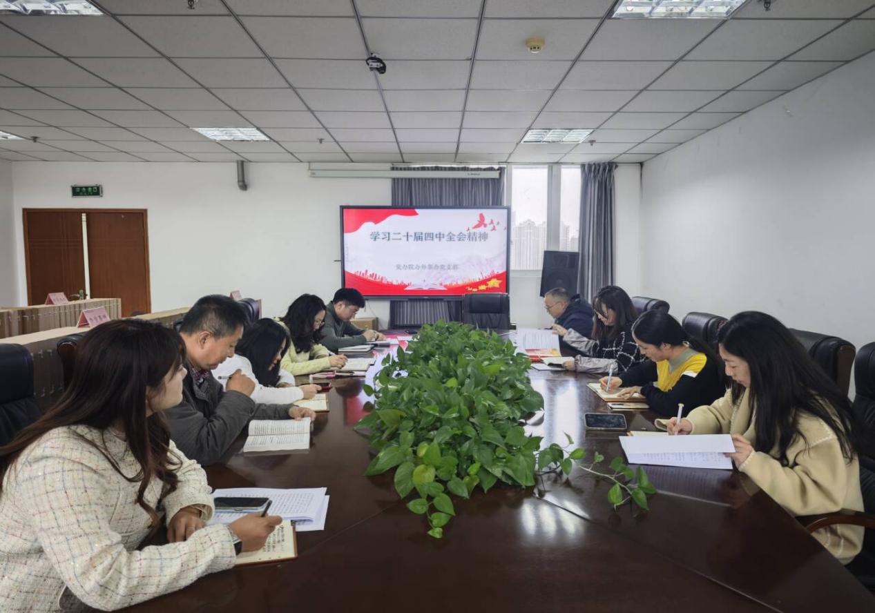 为深入学习贯彻党的二十届四中全会精神,切实把支部党员思想和行动统一到党中央决策部署上来,11月12日下午,党办院办外事办党支部召开专题学习会,集中学习领会二十届四中全会精神。党支部书记刘依灵主持会议,全体党员同志参加。