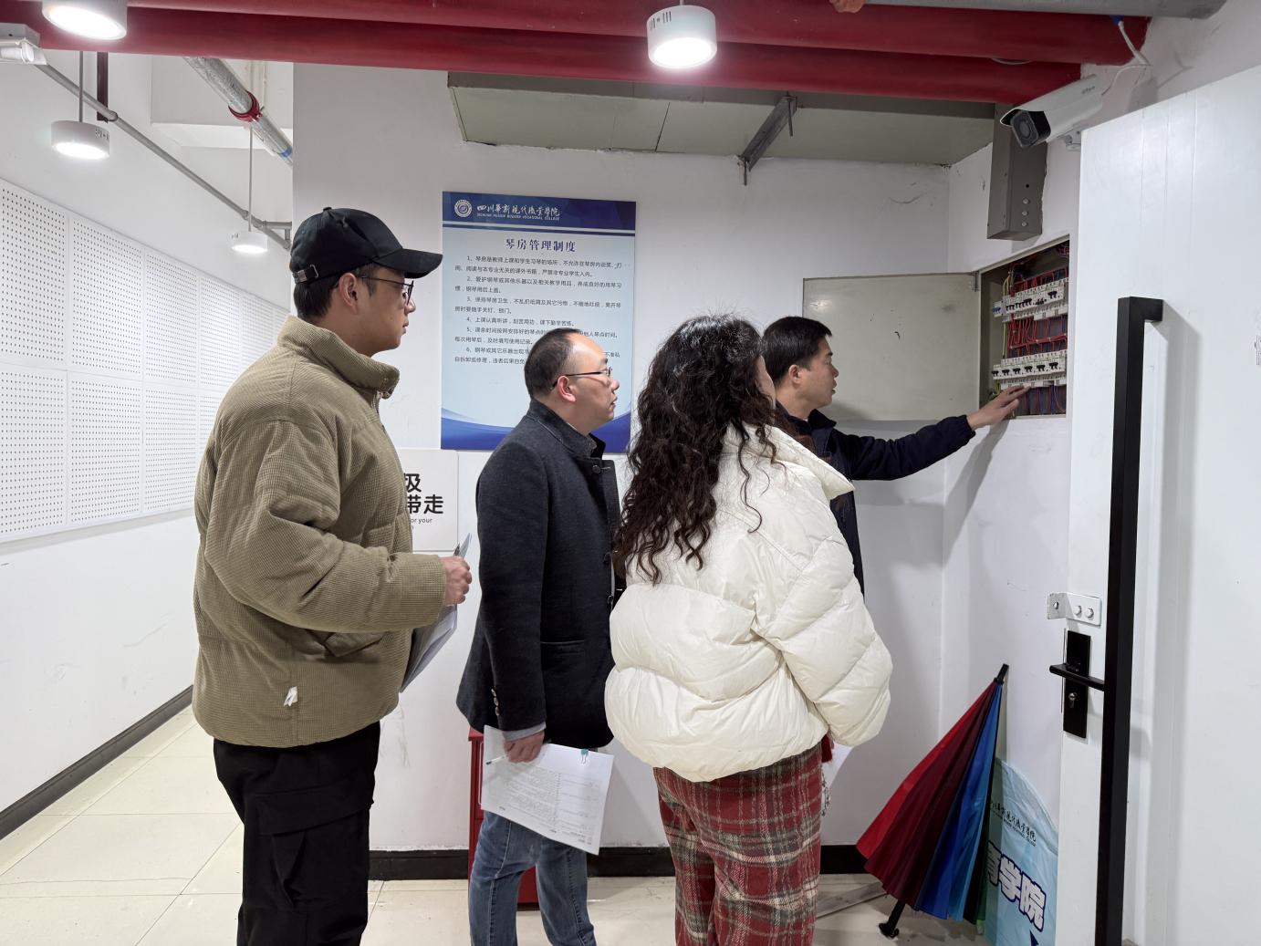 在钢琴实训室,围绕配电箱线路未标识等电气安全隐患展开排查,同步检查消防通道畅通性及应急照明设备运行状态,确保实训环境符合消防安全规范。