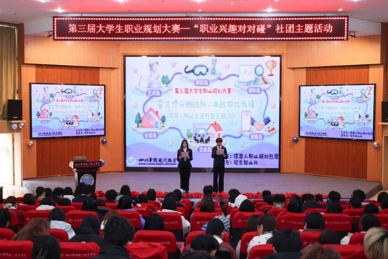 为认真做好第三届大学生职业规划大赛宣传动员工作,将大赛作为加强和改进生涯教育、促进高质量充分就业的重要载体,发动更多大学生和教师了解大赛,11月21日,由华新职院“摆渡人”职业生涯社团主办、“摆渡人”职业生涯咨询室协办、招就处指导的第三届大学生职业规划大赛配套活动——“职业兴趣对对碰”在学院学术报告厅成功举办,活动以霍兰德职业兴趣理论为依托,通过趣味竞技、大咖分享等形式,带领同学们在活动中探索职业兴趣、主动关注生涯发展、科学规划未来。