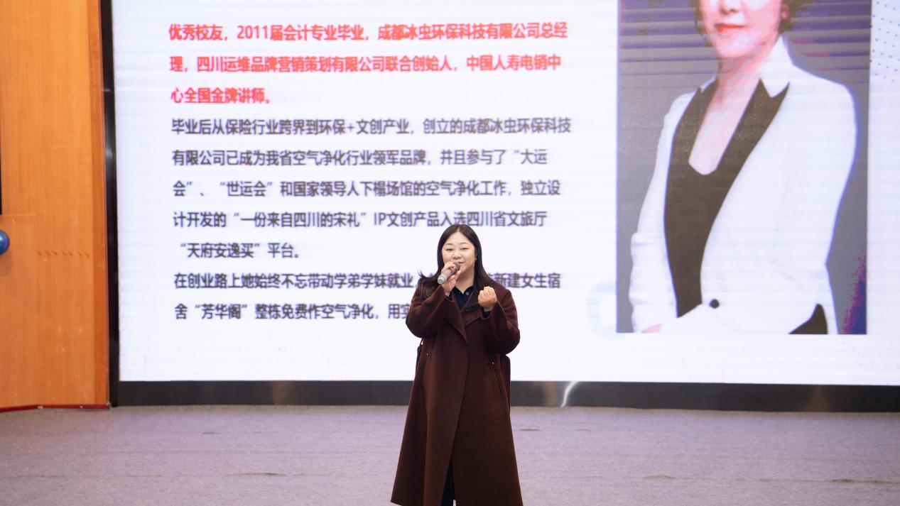 成都冰虫环保科技有限公司总经理,四川运维品牌营销策划有限公司联合创始人、中国人寿电销中心全国金牌讲师、学员2011届优秀校友倪槐梓亲临现场,带来跨界成长分享,她从保险行业到环保+文创产业,以“大运会”“世运会”空气净化项目、“一份来自四川的宋礼”文创IP等实战案例,展现了职业兴趣与时代需求结合的无限可能,更以“芳华阁”宿舍空气净化的感恩行动,传递了华新人的责任与担当。