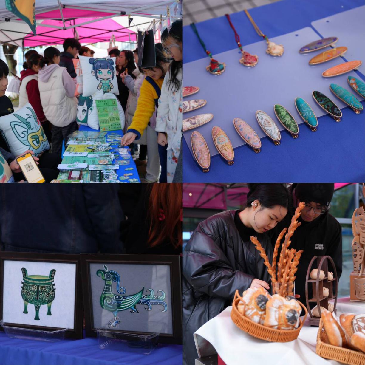 展品丰富、形式多元,包括以三星堆形象元素设计的抱枕、耳饰、创意配饰、文化徽章、主题绘画作品,以及以青铜面具、神鸟图案为灵感开发的面食小点心等文创作品,充分体现了学生在文化理解、创意表达与文创转化方面的综合能力。