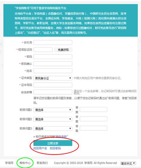 注意:身份证号码重复。如果您使用的身份证号码已被注册使用,请首先确认是否曾经注册过学信网账号,若已注册过,请通过“找回用户名、找回密码”功能找回原有账号。若未注册过账号的,请参考学信网身份证号码重复的解决办法来完成注册。