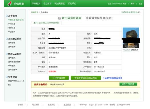 4.点击“高等教育信息”(如箭头所示),进入个人学籍档案,可以看到个人学籍信息及高考照片等,如下图:
