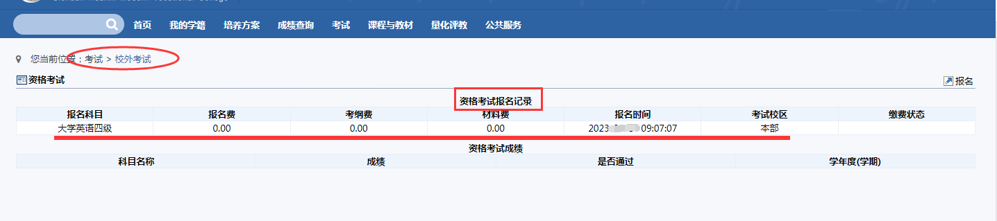 是否乘坐班车、是否需要材料、是否需要考纲等项目无须选择,选择报名即可。提交预报名信息成功后,通过考试>校外考试,可以查看报名记录。
