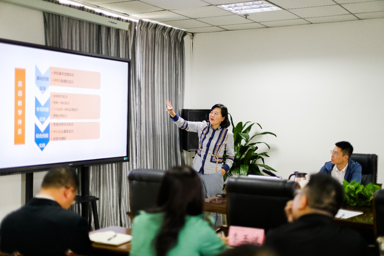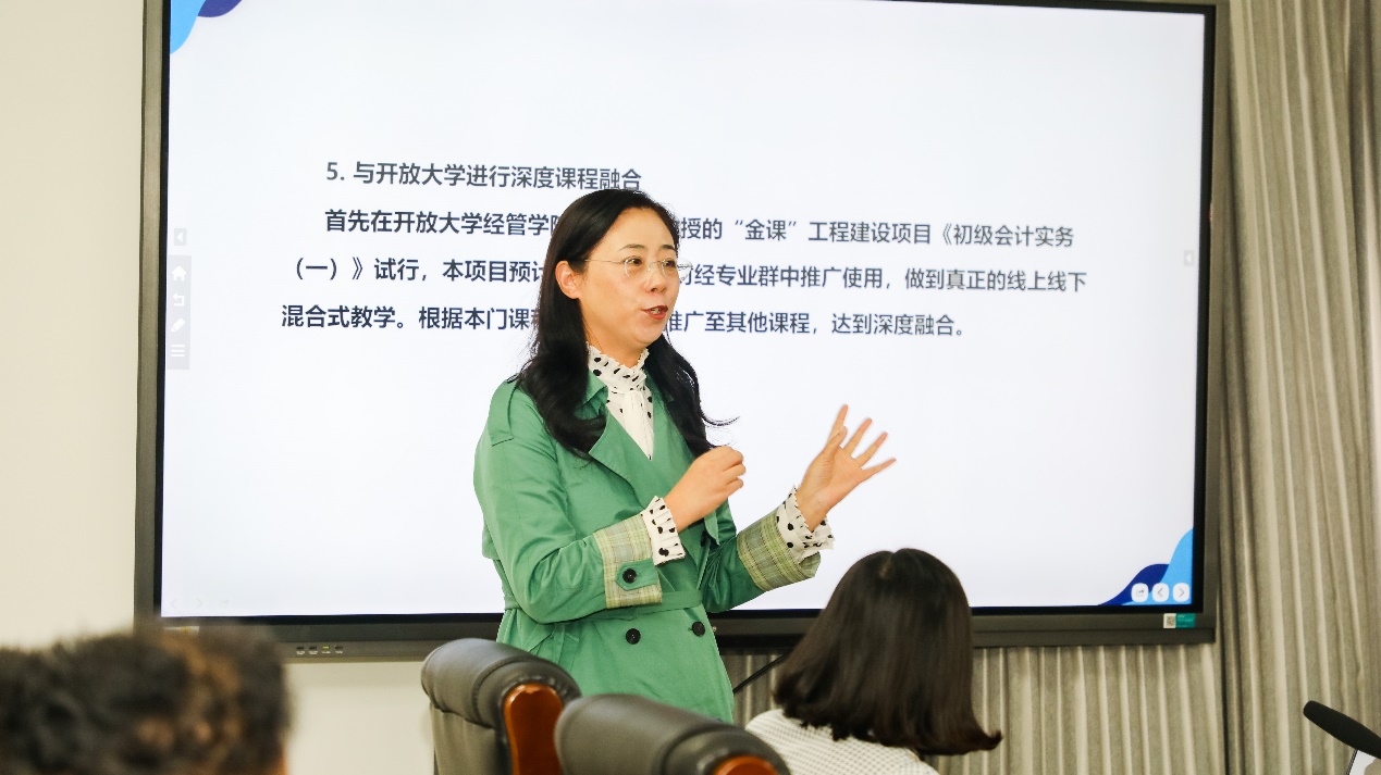 陈欣邀请四川开放大学李玉波教授介绍了与开放大学进行深度课程融合的情况,学院从参与开放大学“金课”工程建设项目《初级会计实务(一)》入手,积累经验,再推广至其他专业群课程建设,达到深度融合。