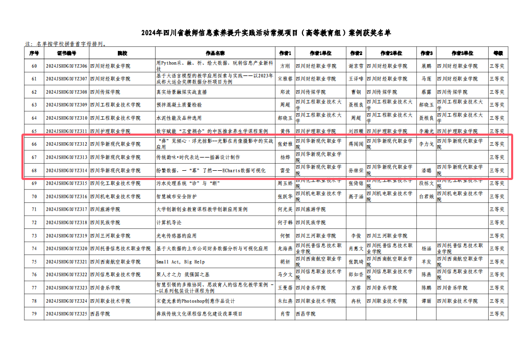 近日,四川省教育厅正式公布了2024年四川省教师信息素养提升实践活动常规项目(高等教育组)获奖名单,华新学院艺术学院张舒雅、蒋闯闯、李力戈教师团队的参赛作品《"彝"见倾心.浮光掠影---光影在肖像摄影中的实战应用》、文创旅游学院杨烨老师的参赛作品《传统韵味•时代表达——插画设计制作》以及计算机与大数据学院雷莹、孙继荣、潘璐教师团队的参赛作品《纷繁数据,一“幕”了然——ECharts数据可视化》荣获三等奖!以上三件获奖作品均成功获得省级推荐,将代表学院参加2024年全国师生信息素养提升实践活动(第二十八届教师活动)。