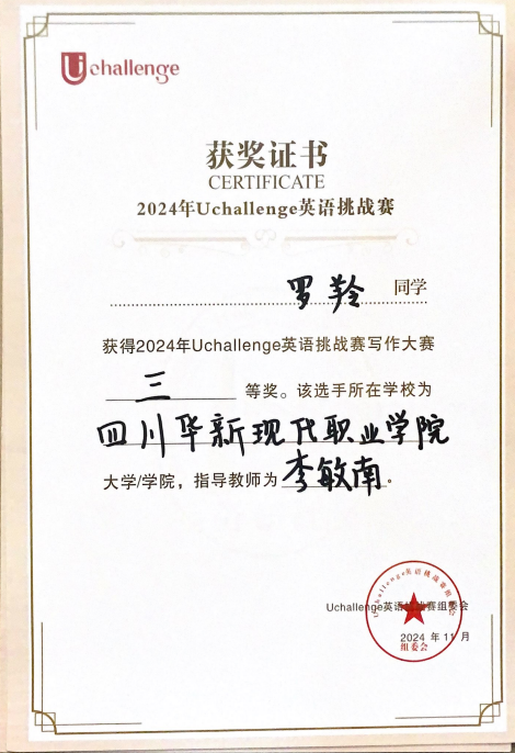 2024年11月30日,由四川省教育厅主办,四川工程职业技术大学承办的2024年“中银杯”四川省高等职业院校Uchallenge英语挑战赛在四川工程职业技术大学举行,全川高职院校的近三百多名选手参加此次比赛。我院参赛选手医护康养学院23级护理专业学生罗羚在指导老师的辅导下,经过前期刻苦努力和专业化的训练,在本次比赛中获得英语写作大赛三等奖。