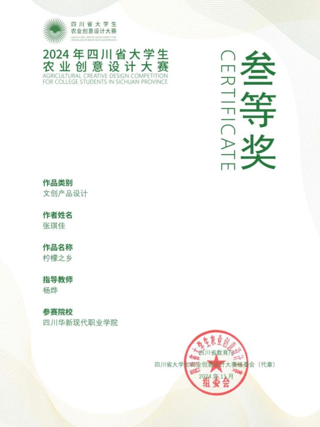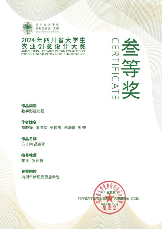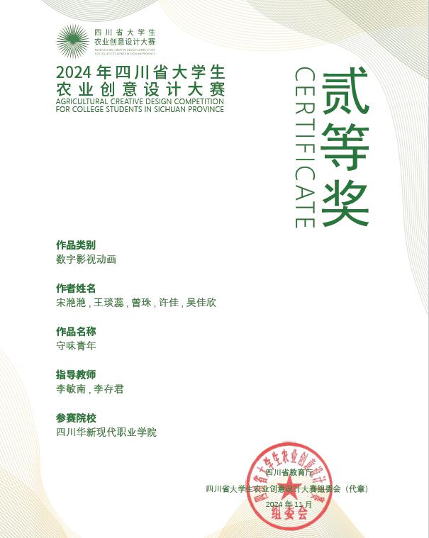 近日,由四川省农业农村厅、四川省教育厅主办,四川农业大学承办的四川省大学生农业创意设计大赛落下帷幕。由教务处李敏南老师和数字经济学院李存君老师指导的数字影视动画作品《守味青年》荣获省赛二等奖,由数字经济学院黎亚老师和罗能铮老师指导的数字影视动画作品《方寸间 品百年》荣获省赛三等奖,由文创旅游学院杨烨老师指导的品牌形象设计作品《李庄鲜果》和文创产品设计作品《柠檬之乡》荣获省赛三等奖。