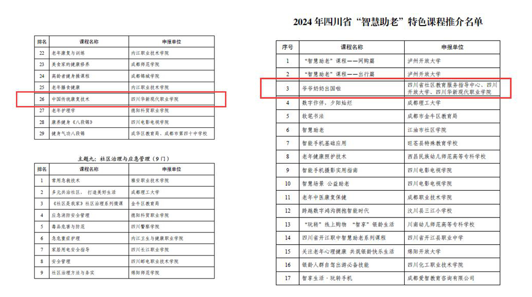 近日,四川省教育厅公布了2024年四川省“能者为师”“智慧助老”特色课程和典型案例的推介名单,我院1门“能者为师”特色课程《中国传统康复技术》(康养健身主题)、1门“智慧助老”特色课程《爷爷奶奶出国啦》和2个“能者为师”典型案例《“蜀绣传承新篇章”社区教育助力非遗文化焕发新生》(非遗传承主题)、《社区古法康健悦邻里》(康养健身主题)成功入选。