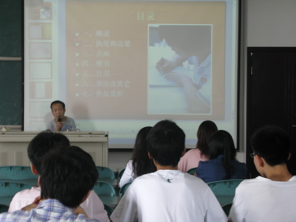 图片二:《硬笔书法》课上,尹嘉伟大师对学生介绍我国传统书法文化艺术知识和硬笔书写作品知识。