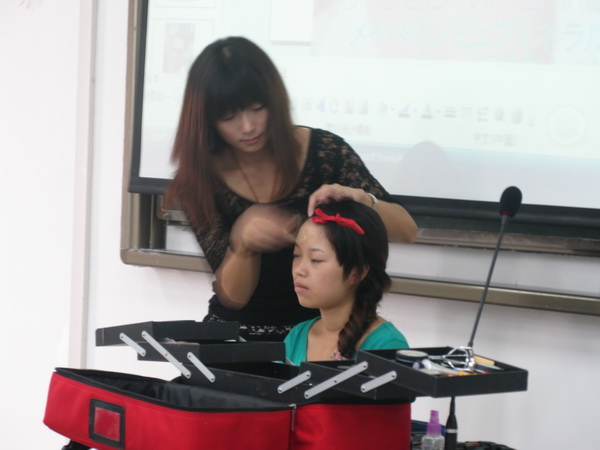 图片三:《化妆造型》课上,刘宏敏老师正为学生示范化妆技巧。
