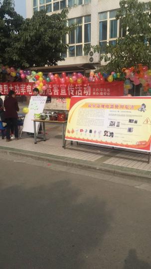 活动中展示了本学期在安全大检查中查出的违规电器,如:热得快、电饭煲、烧水壶。同时该活动还利用展板向同学们说明了使用违规电器的危害。与“拒绝使用违规电器”宣传活动同时进行的还有“烟换糖”活动。吸烟有害健康,尤其是对处于成长过程中的学生来说,危害极大。路过活动现场的学生也自愿掏出兜里的香烟来换取甜蜜蜜的糖。“扔飞镖送糖”的游戏环节,增加了本次宣传活动的趣味性,老师、同学们都积极参与进来,浓厚了现场活动氛围。